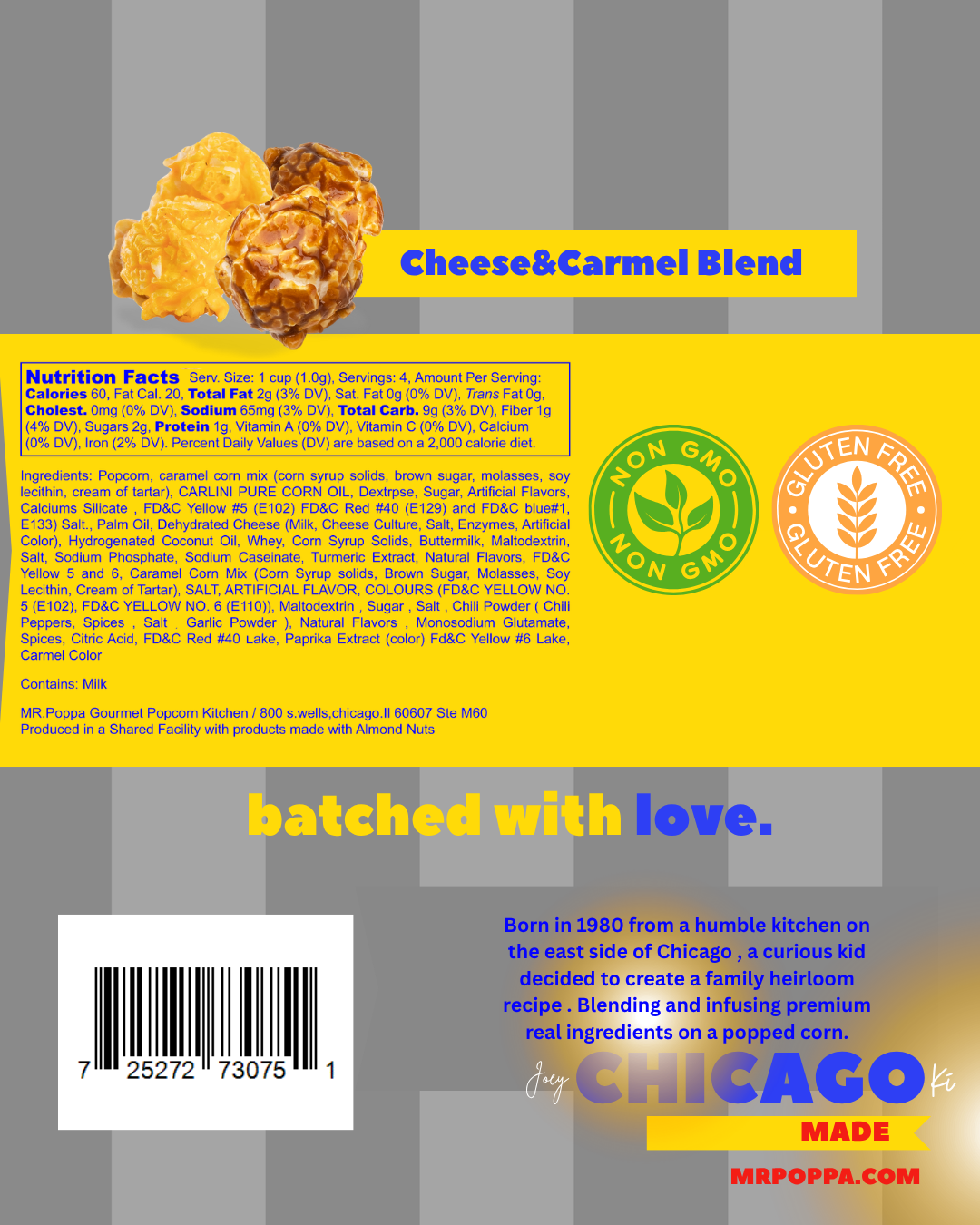 Experience a taste of the Windy City with Mr.Poppa's Chicago Mix- a unique, gourmet popcorn snack! Enjoy the classic combination of sweet caramel and savory cheese popcorn, guaranteed to leave your tastebuds delighted. Treat yourself to an exclusive snack and savor the flavor of Chicago!